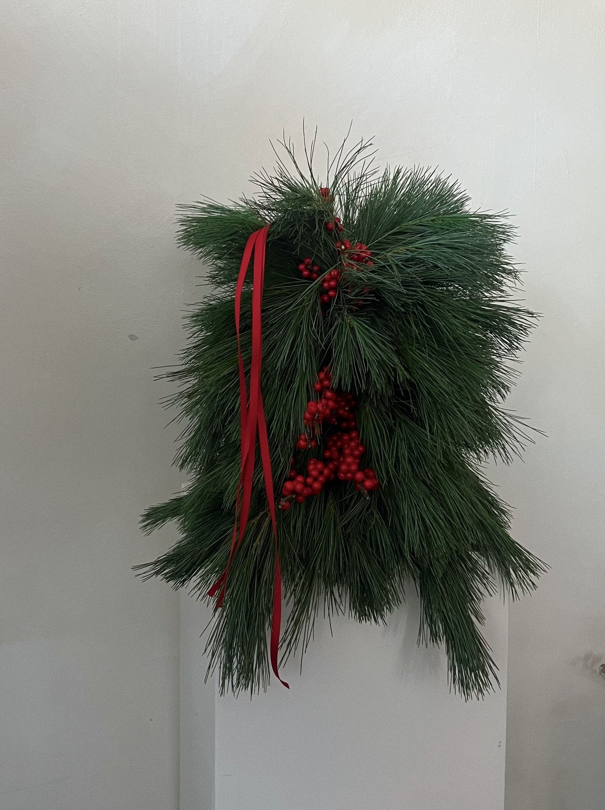 Each arrangement is hand-built with layered Scots pine branches and accented with seasonal berries, creating a light, “hairy” silhouette full of movement and character. Finished with a simple ribbon for a subtle festive touch.