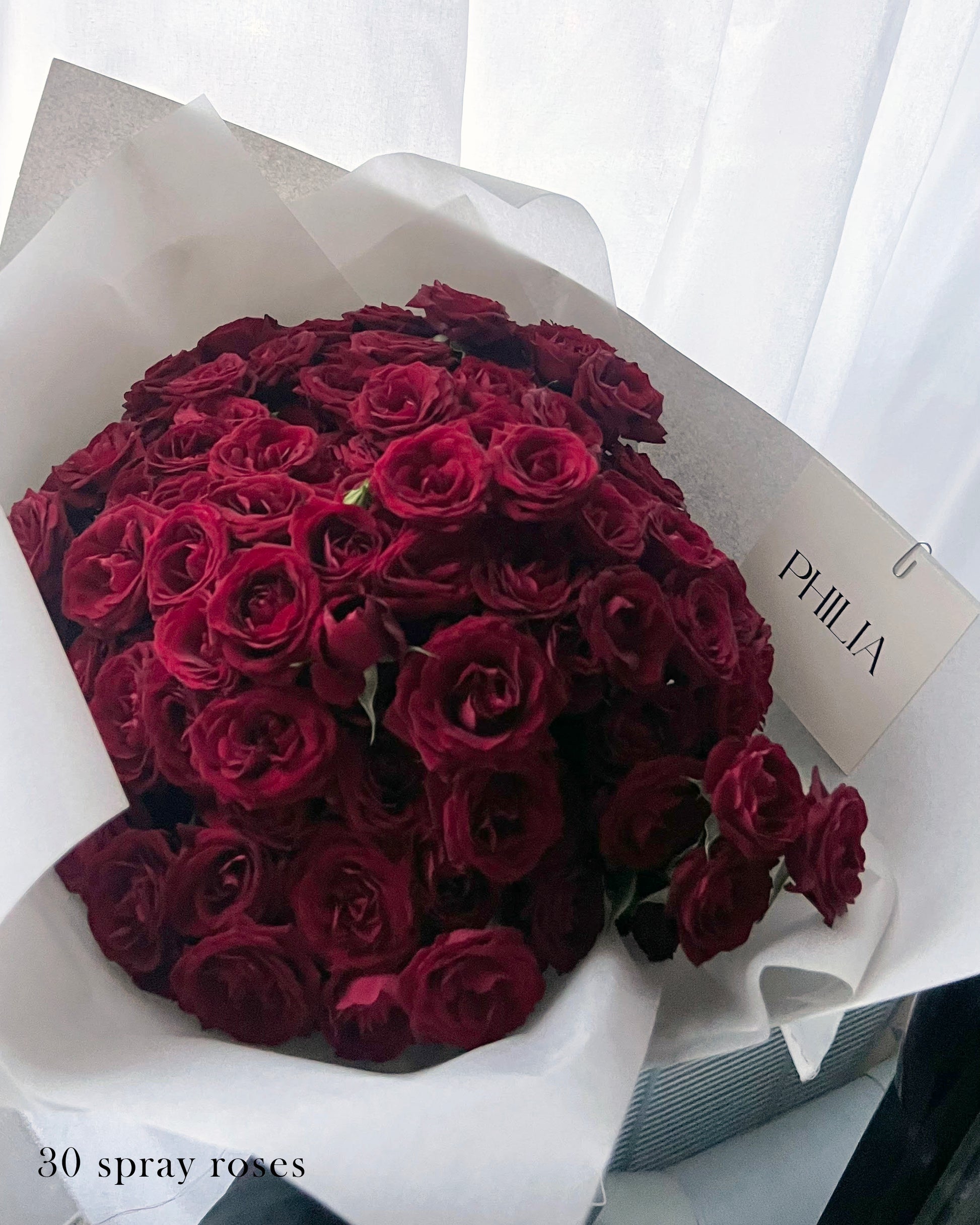 A paper-wrapped bouquet designed with red spray roses, offering a classic yet modern look. The example shown features 30 stems, with each stem carrying 2–4 rose heads. Spray rose has smaller head compared to regular roses.